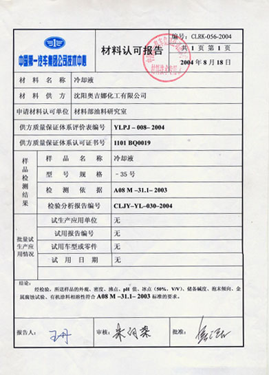 沈陽奧吉娜化工有限公司繼防凍液獲得一汽集團技術中心認證后,DOT3制動液于09年5月13日再次獲得一汽集團技術中心認證,為奧吉娜化工有限公司制動液在一汽集團所屬的汽車制造廠和售服系統推廣提供了及其有力的條件。使得雙方在配套領域的合作關系得到了進一步的加強。同時提升了奧吉娜化工在全國范圍內汽車油品配套領域的知名度和影響力。